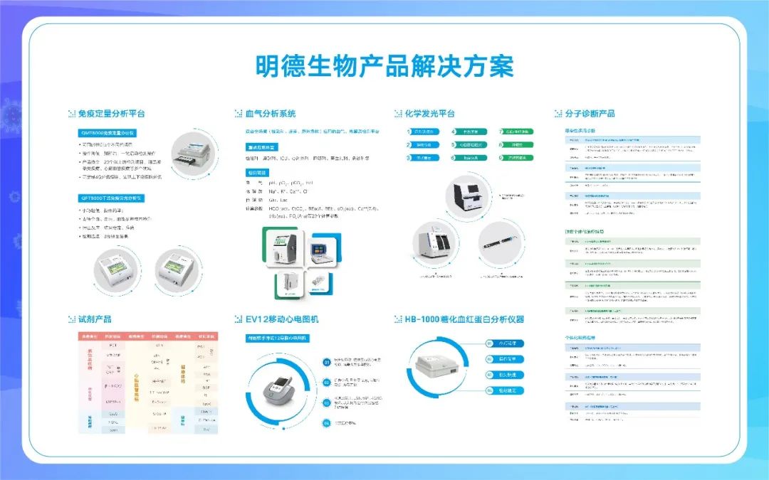 此次展會(huì),明德生物攜發(fā)熱門(mén)診智能化建設(shè)、PCR實(shí)驗(yàn)室建設(shè)、急危重癥一體化等醫(yī)療服務(wù)方案和POCT、化學(xué)發(fā)光、血?dú)夥治觥⒎肿釉\斷等檢測(cè)平臺(tái)及配套試劑精彩亮相!