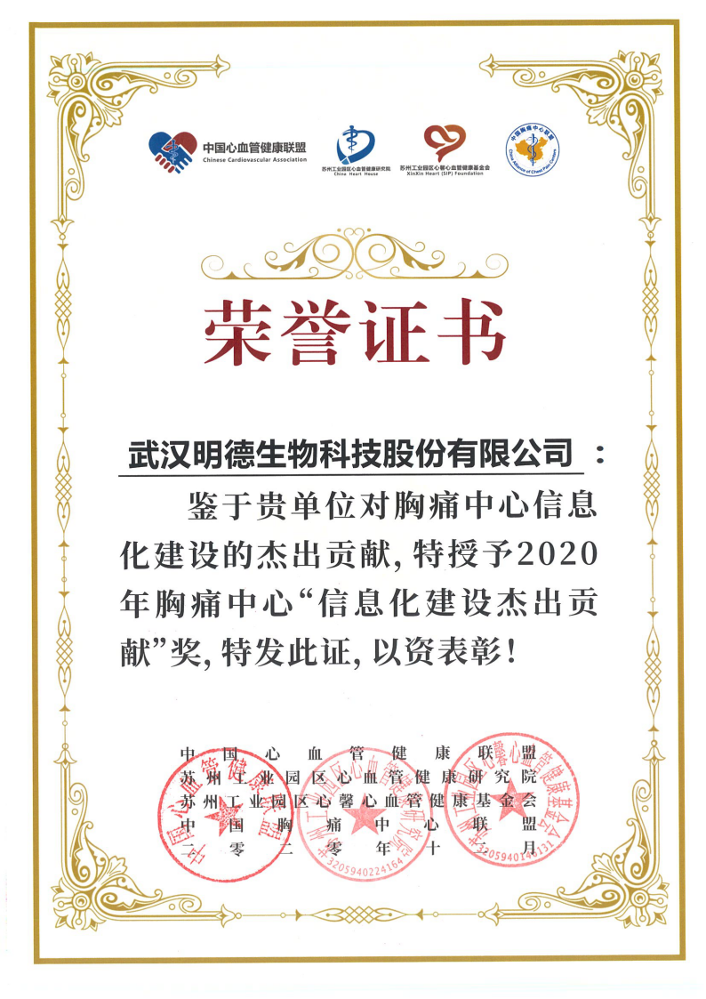 2020年12月召開的全國第十屆胸痛大會上,明德生物斬獲“信息化建設(shè)杰出貢獻(xiàn)”獎項(xiàng)。明德生物合作的武鳴區(qū)中醫(yī)醫(yī)院、十堰市太和醫(yī)院及英山縣人民醫(yī)院三家醫(yī)院也分別取得了“智慧胸痛中心建設(shè)優(yōu)秀獎”獲得行業(yè)肯定。